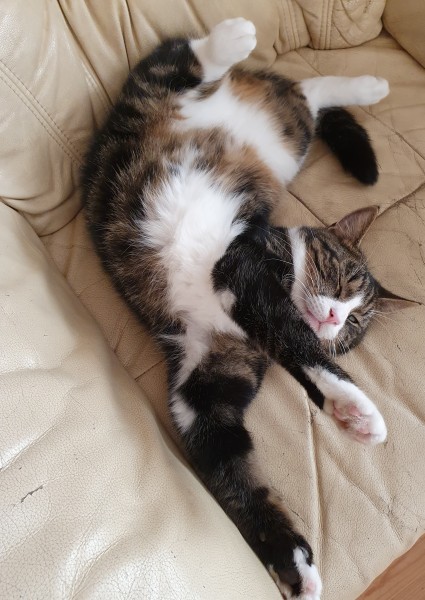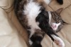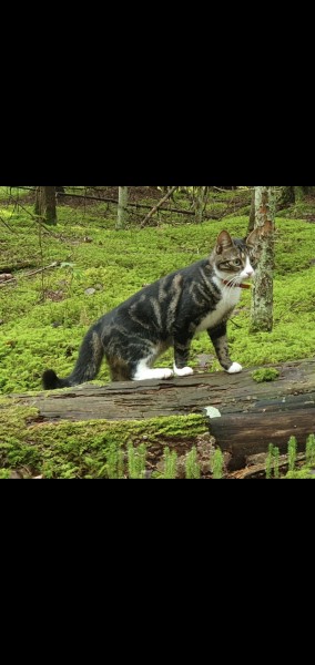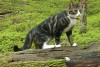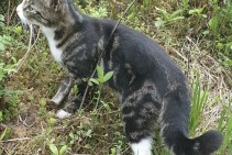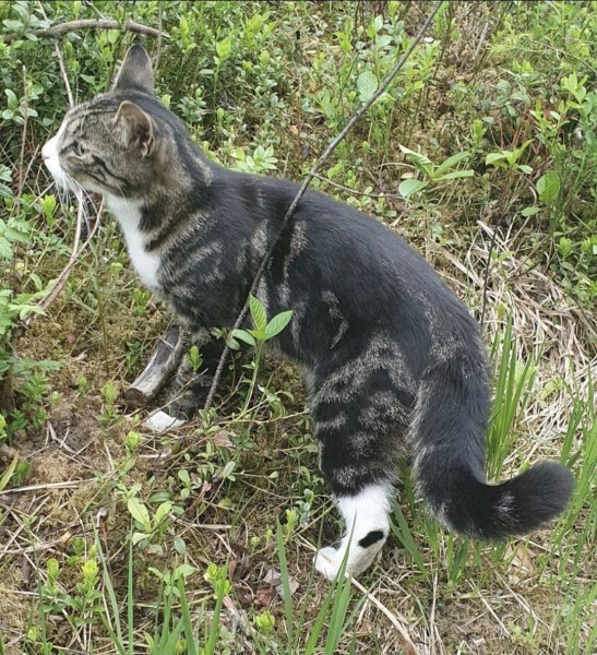 Pelēks ar marmora zīmējumu. Baltas ķepas uz kreisās pakaļkājas baltās zeķītes pēdas daļas melns aplīts.