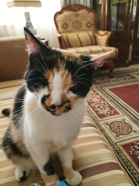 Trīskrasaina (balta, melna, rūda) kaķiene, deguns uz pusi melna, uz pusi roza krāsa, balts krūts.
