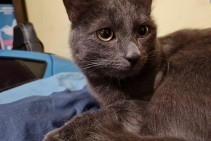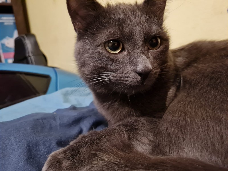 Tumši pelēks vidēja auguma kaķītis. Bailīgs, nav radis dzīvot ārpus mājas, svešiem rokās īpaši nedodas. Vārdā -Lucifers.