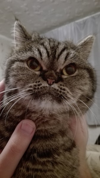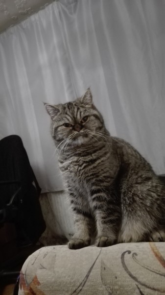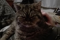 Pelēka, strīpaina kaķenīte. Iespiests uz iekšu purniņš.
