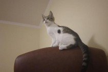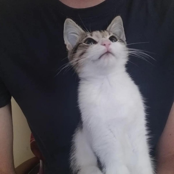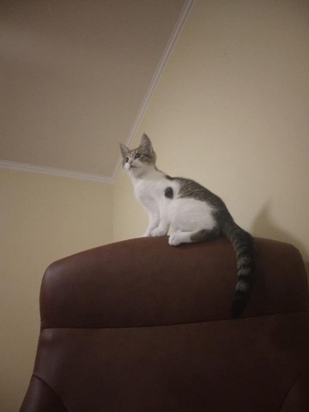 Maziņa, nav kupla, melna mutīte, spicas ausis, raiba. Vairāk foto.