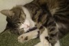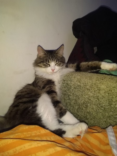 Atsaucas uz vārdu Mimī. Ir ar pūkaini-strīpainu kažociņu un kuplu asti, pelēkā ar baltu nokrāsu. Ap kaklu brūna blusu siksniņa. Nav pieradis pie ielas. Ir bailīgs.