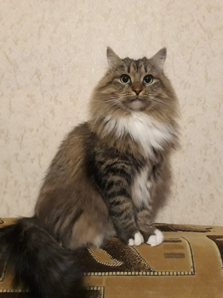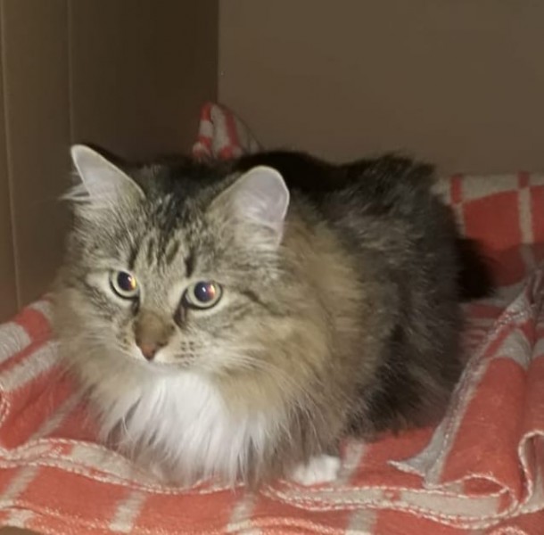 Mājas kaķene, pelēka ar balto krūti un vēderi, pūkaina, bezšķirnes, sterilizēta, čipota un vakcinēta. Parasti nāk pie svešiem, bet kā uzvedīsies ielas apstākļos, grūti prognozēt.