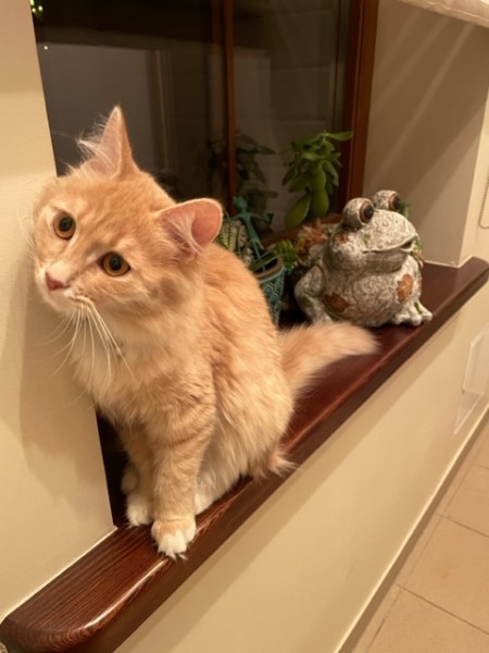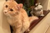 Jauna kaķenīte sarkanas krāsas apkakli. Sirsnīga, nav bail no suņiem.