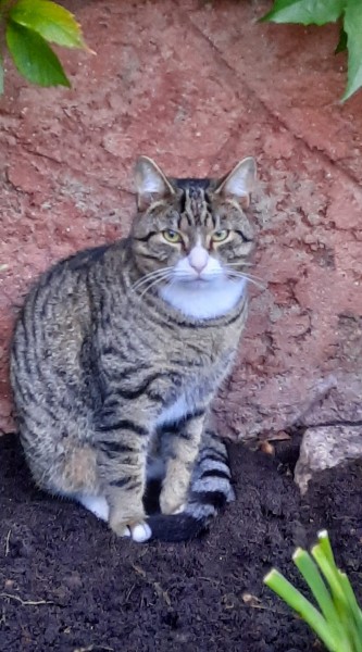 Tumši pelēks strīpains kaķis ar purngalu, pirkstiem un "sirsniņu" uz krūtīm baltā krāsā.