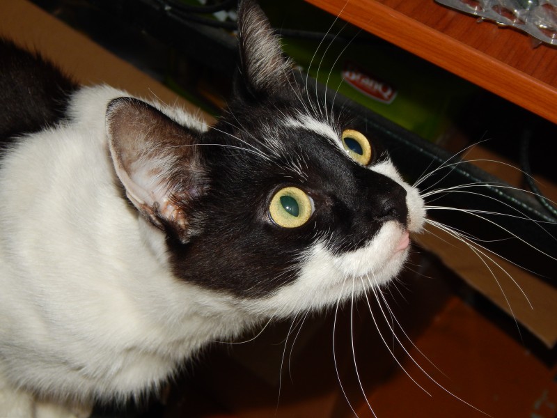 Melnbalts kaķis, vidēja auguma, ap kaklu bija zila siksniņa