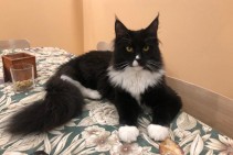 Pazuda mein-kuns, melns ar baltām ķepiņām un purniņu, garo pūkaino asti. Ulbroka, Meiju ielas rajons