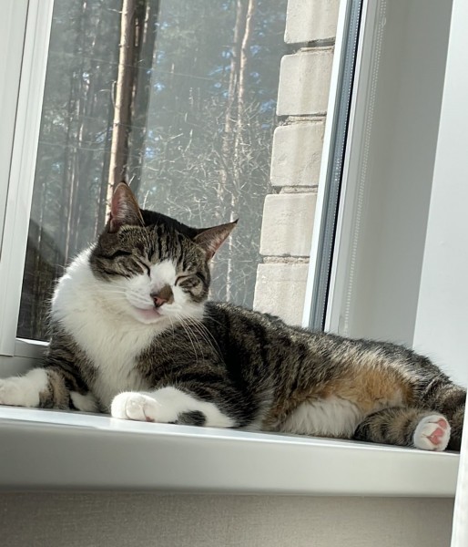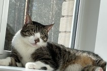 Mājas kaķis, ļoti baidas no ielas. Pietiekami liels un apaļīgs.