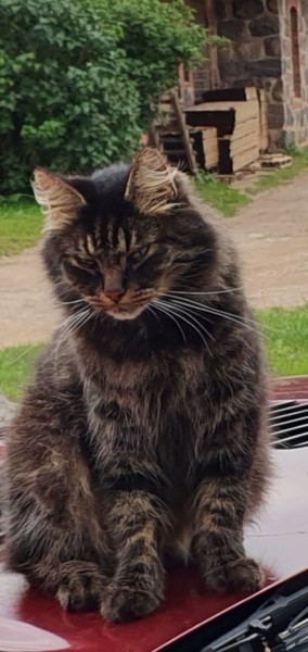 Tumši raibs, pūkains, kuplu asti, draudzīgs, neatkarīgs. Gēnos Norvēģijas meža kaķis krustojumā ar bez šķirnes minci.