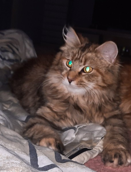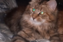 Viena austiņa robaina, gara aste, līdzīga meinkūna šķirnes kaķim. Ļoti bailīga.