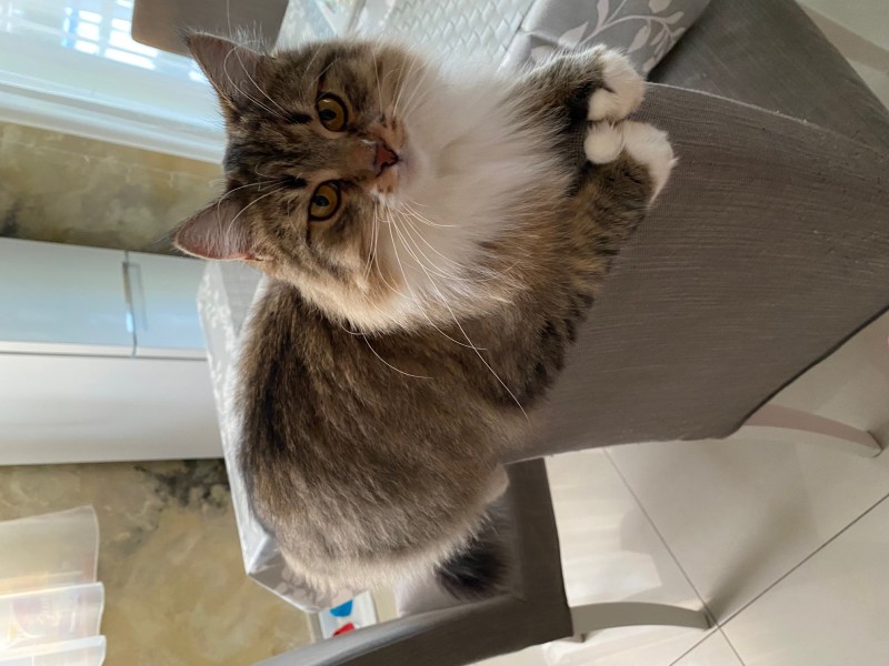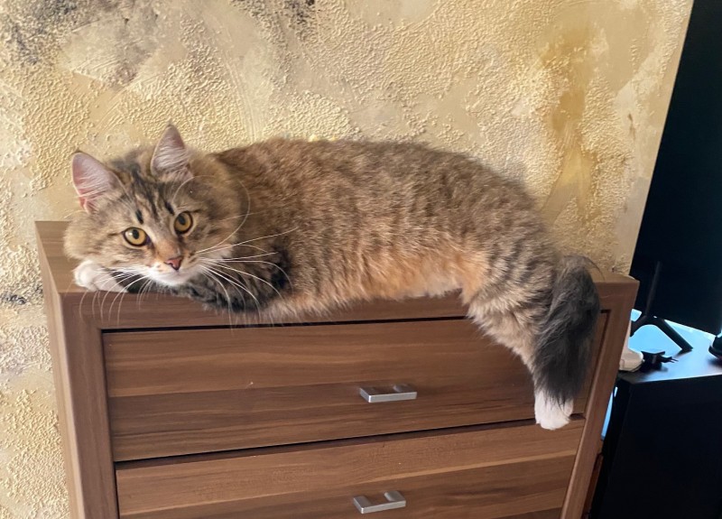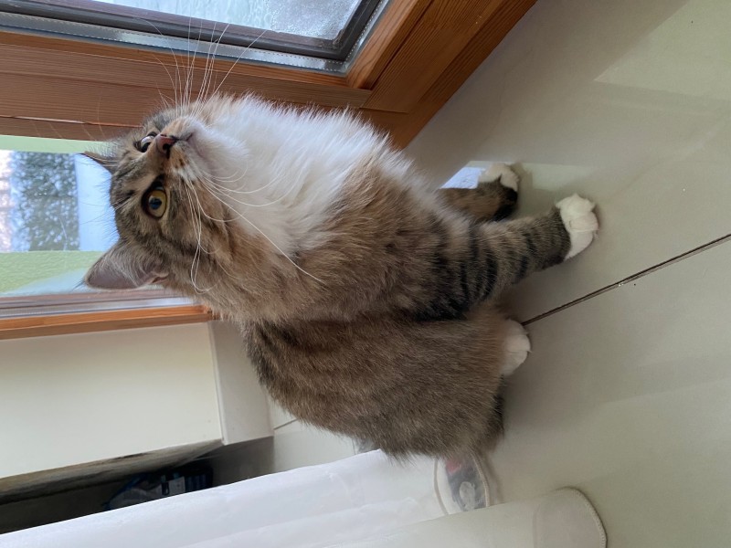 Gudrs kaķis, reaģē uz iesauku Mia. Krāsa - pelēkbrūna, balta apkakle un ķepas, pūkaina aste.