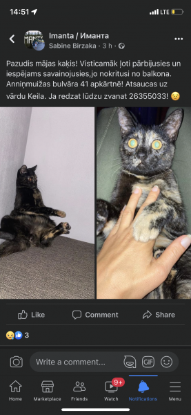 20.06 no rīta,Imantā Anniņmuižas bulvārī 41 pa balkonu izlēca melni- raiba kaķenīte! Atsaucas uz vārdu Keila! Ļoti draudzīga,bet pieņemu,ka pašlaik pārāk nobijusies! Ļoti ceram ka atradīsies! Telefona nr 26355033