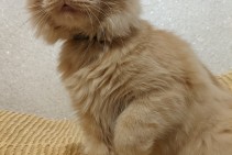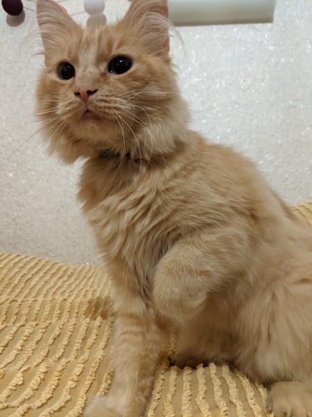 Ruds pūkains kaķis. Atsaucas uz vārdu Pipars (Pipariņš), ap kaklu pelēka siksiņa.