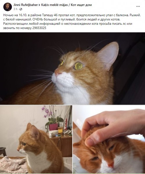 Tapešu iela 46 rajonā, naktī uz 16.10. 2022 pazudis ļoti liels, ruds runcis ar baltu krādziņu. Ļoti bailīgs. iespējams, nokritis no balkona.