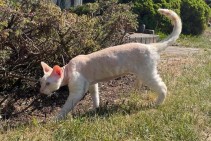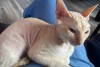 1,5 gadu jauns donas sfinksa šķirnes runčuks ar īsu baltu spalvu un zilām acīm.