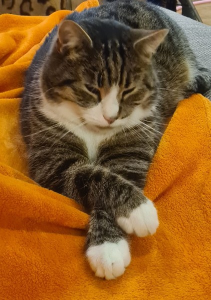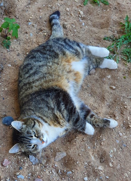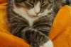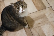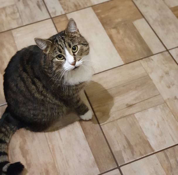 Strīpaina kaķenīte ar baltu apkakli, deguntiņu un ķepiņām. Atsaucas uz vārdu Minna.