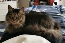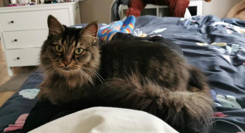 Pazīmes: maziņa, pūkaina, ap kaklu rozā ērču siksniņa, zaļas acis. Noteikti ir sabijusies.