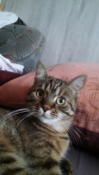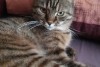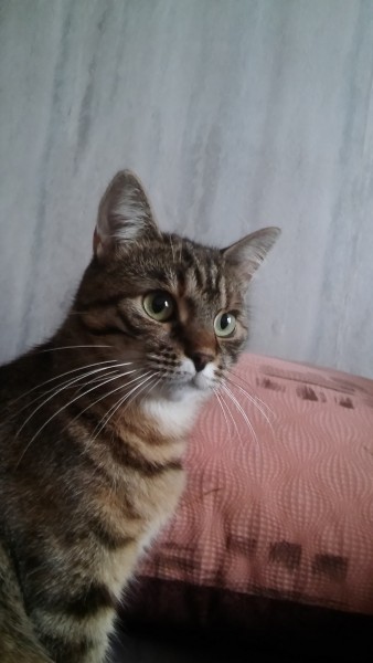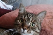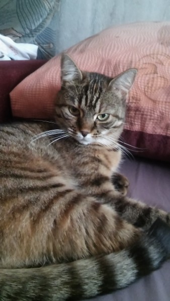 Atsaucas uz vārdu Kika.Pelēki strīpota armazliet rudu akotu,pelēkām ķepiņām,mazu rudu strīpiņu starp austiņām.