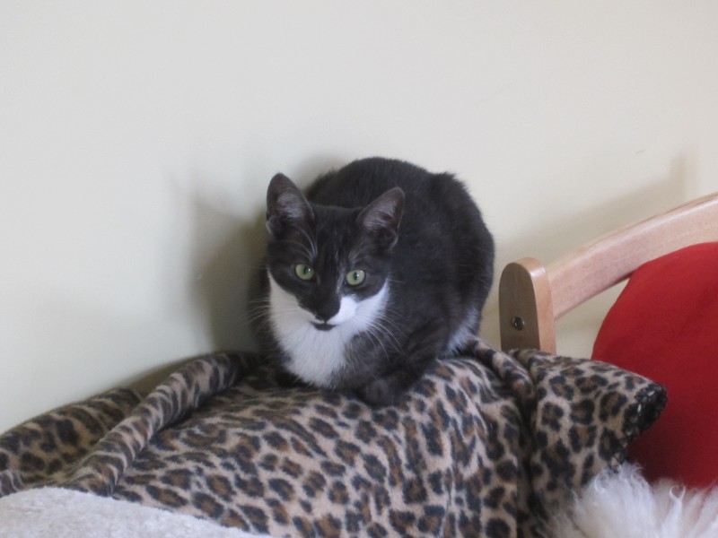 Mājas kaķene, tumši pelēka ar baltu pakrūti, baltiem ķepu galiņiem, līdz pusei baltu aizmugurējo labo kāju un baltu plankumu uz purniņa.