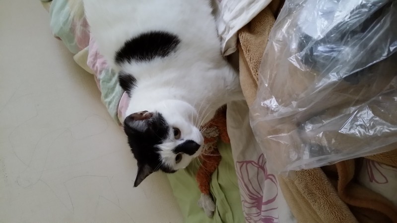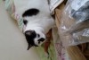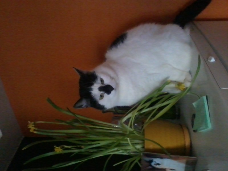 Balta ar melnu cepurīti, melnu degunu, asti un plankumiem uz sāniem. Bailīga mājas kaķenīte. Pazuda jūnija beigās. Sauc Bessi.