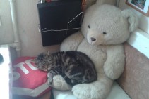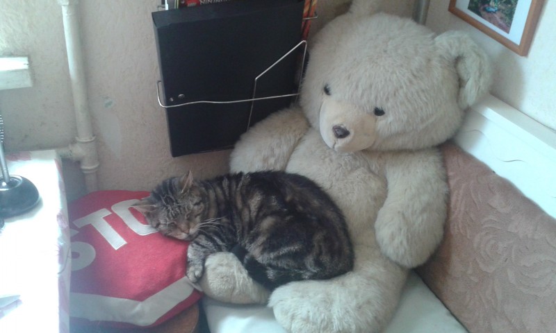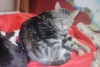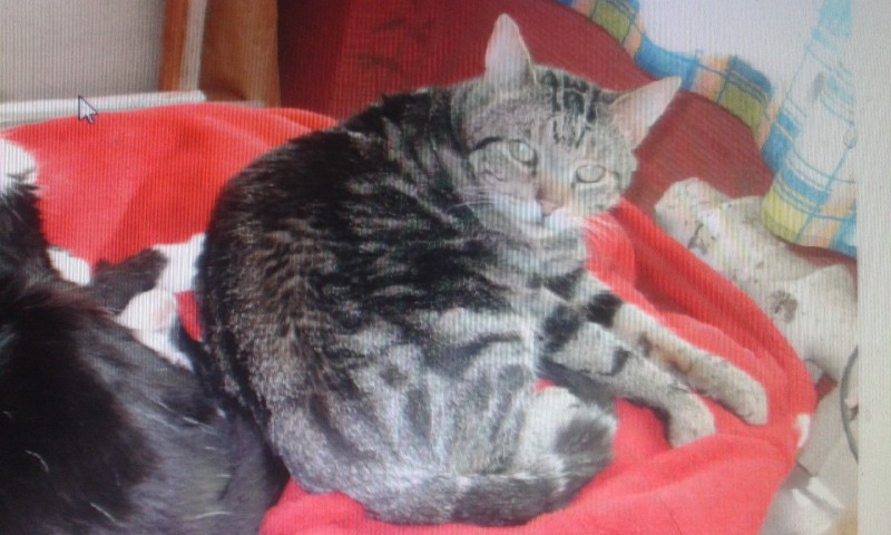 Pelēks,strīpains,ar dzeltenīgi brūnu.Strīpas melnas.Vēders plankumains.Mutē tikai ilkņi.Kastrēts.8 gadi.Izkrita pa logu,var būt savainots.Ļoti bailīgs.Varēja kaut kur noslēpties.Iespējams,aizvests citur.Ārā nekad nav gājis.
