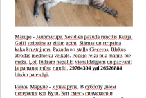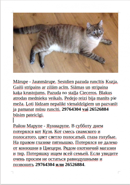 Gadu vecs kastrēts kaķis Kuzja, pazūdis 18.07.2015. Mārupē Cieceros. Iespējams dodās mājās pa Stipnieku ceļu uz Lielā iela 39. Kaķis tramīgs, bija savākts no ielas 4 menešu vecumā. Krāsa ka siāmas kaķīm tikai ar strīpām, līdzīgs taiziemiešu kaķiem.