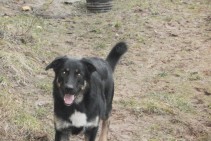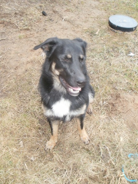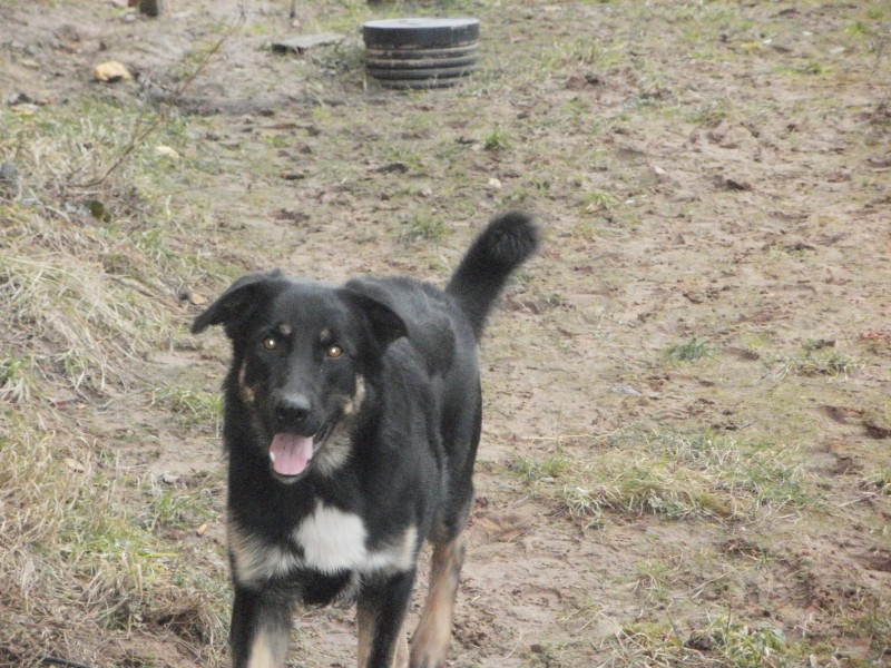 Melns, balta pakakle, brūnas acis un ķepas. Lielas miesasbūves