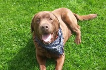 Brūns labradors ar sarkanu kakla siksnu. Nedzird, taču vārds Umberto. Jau pavecs suns; slims - galvas muskuļu zudums ("iekritusi seja"). Pazudis Mārupes-Rīgas robežā.