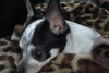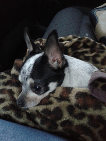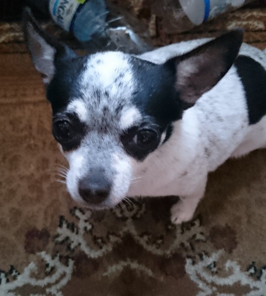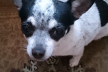 Balta ar melniem plankumiem un melnām ausīm čihua-hua meitenīte, 3,5 gadus veca, klibo ar pakaļkājām, īpaši ar labo kājiņu.