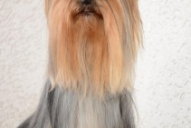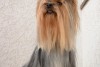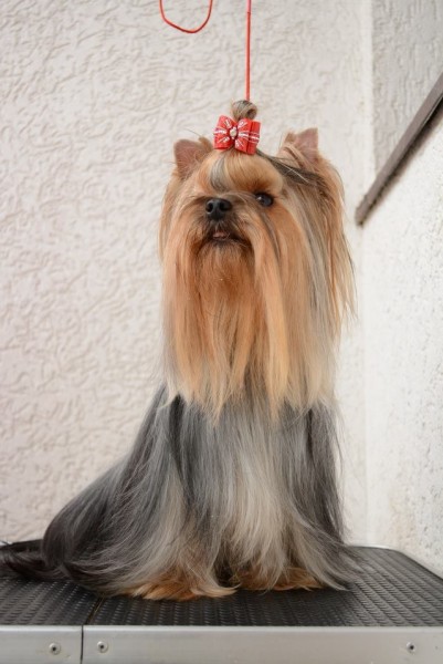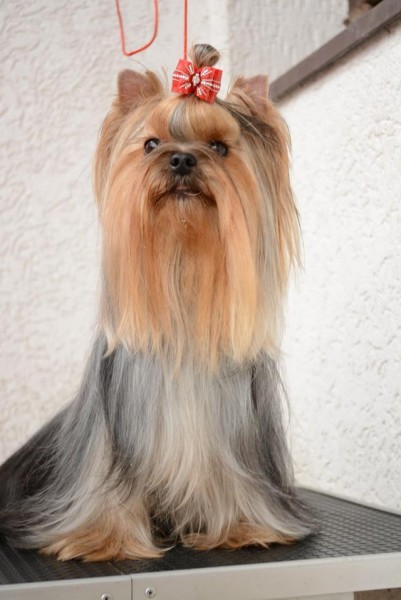 Jorkšīras terjers, atsaucas uz vārdu Barbi, apcirpsta ar bantīti uz gavas.