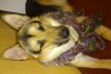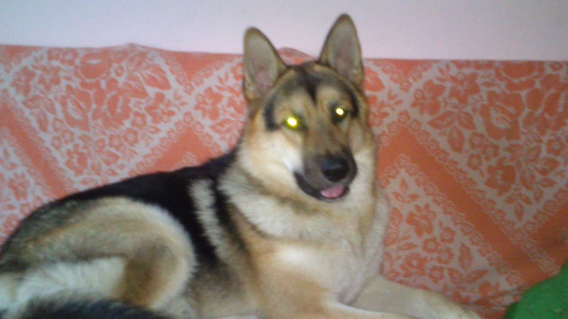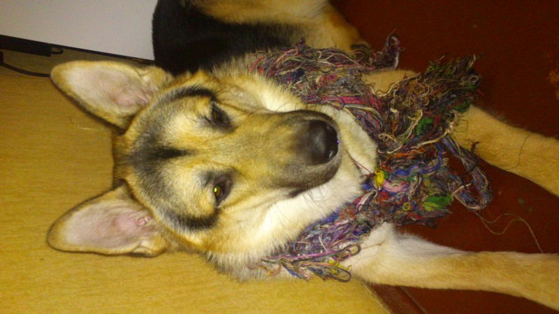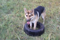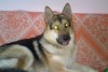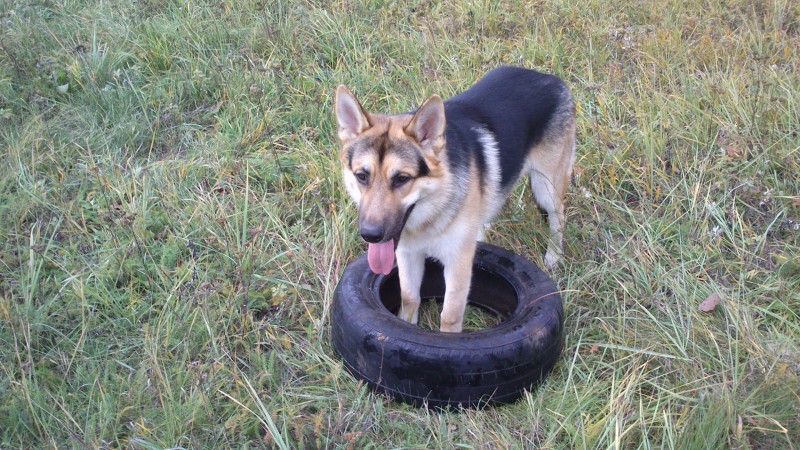 Vācu aitu ar haski krustojums.Uz kakla metāla žņaudzoša ķēdīte.Atsaucas uz vārdu Džeki.