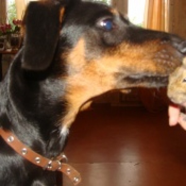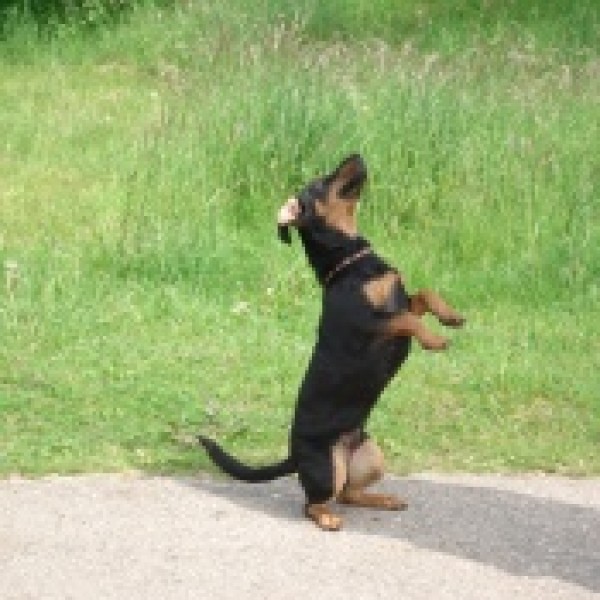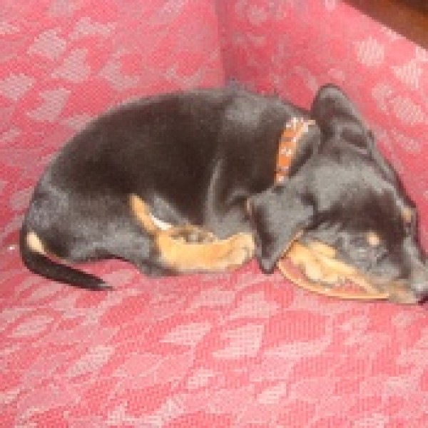 takšveidīgais suns. melns ar brūnu kaklu atsaucas uz vārdu Figaro