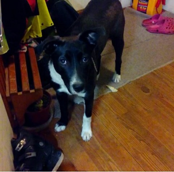 Vidēja auguma melns ar baltu uz kakla siksniņa melna ar sudrabotām kniedēm.Atsaucas uz vārdu Bairo.