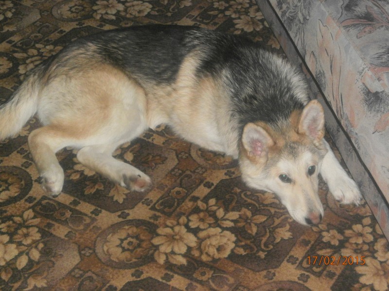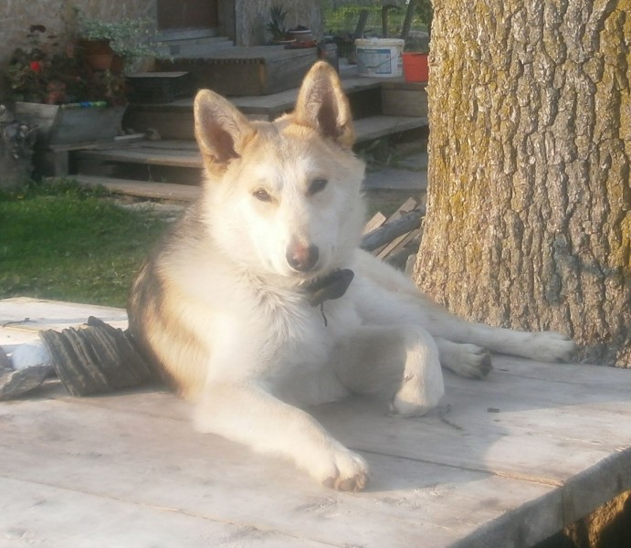 Sauc Larijs. Pusotra gada vecs vilku sugas krustojums ar gaišu degungalu, tumšu muguru, bet gaišu spalvu, brūnām acīm. Ļoti draudzīgs, uzticīgs.