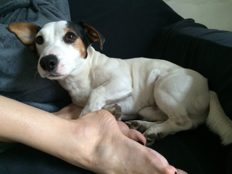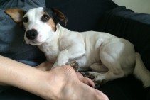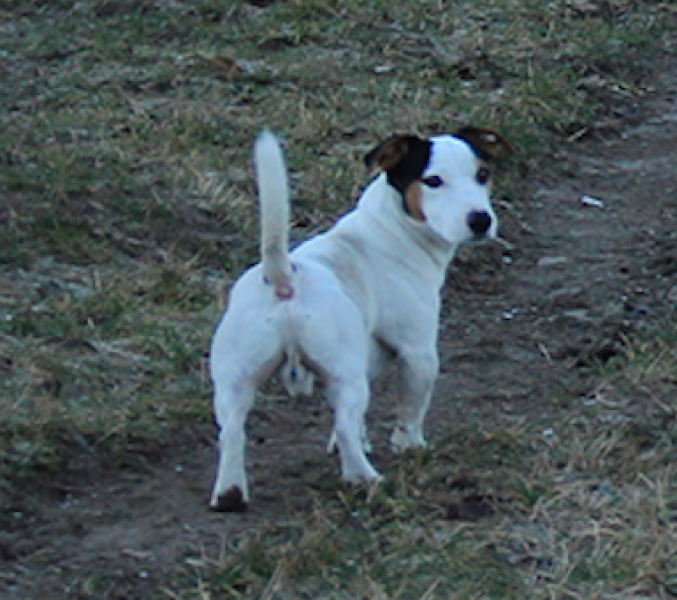 Balts ar melniem plankumiem abās galvas pusēs. Labais vaigs brūns. Nesajaucama pazīme - melns plankumiņš ap 4cm diametrā tur, kur aste pievienojas pie dibena. Ap kaklu siksna ar saimnieka kontaktiem. Ārkārtīgi draudzīgs.