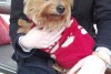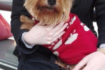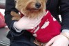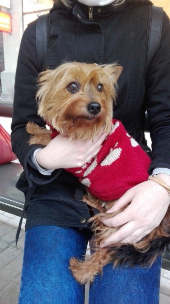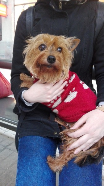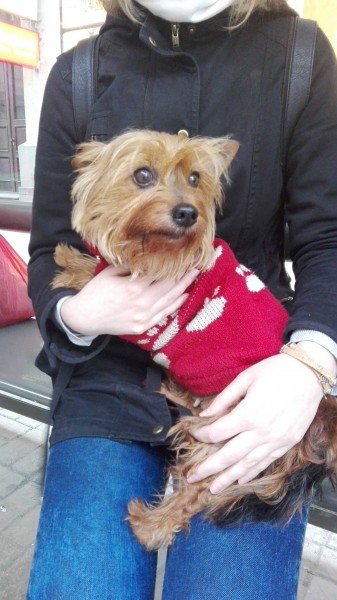 Atrasta jorkšira terjera matīte, aptuveni 10 gadus veca ar tetuvējumu uz kreisa auss. Sarkanā jaciņā ar baltām ķepiņām virsū. Draudzīga.