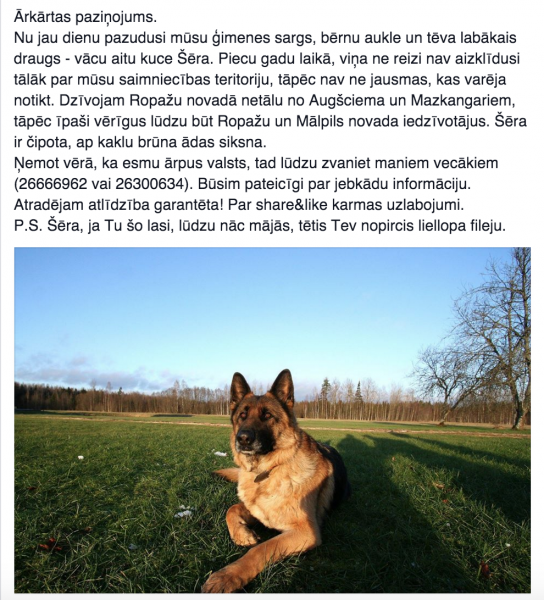 Pazuda 21.02.2016 Ropažu novada Augšciemā, zvanīt -m.t. 26666962,26300634
