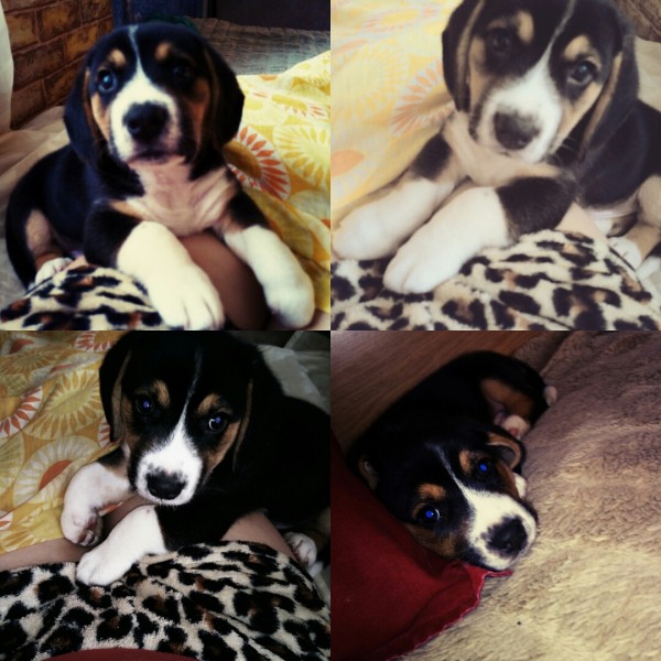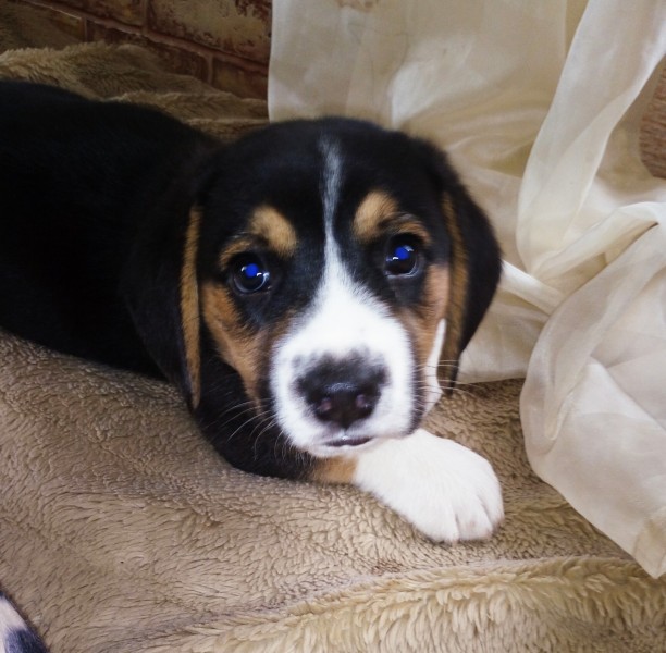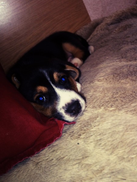 Kucēns ir trīs krāsās. Balts ar melnu un mazliet brūns. Atsaucās uz vārdu Riko.