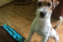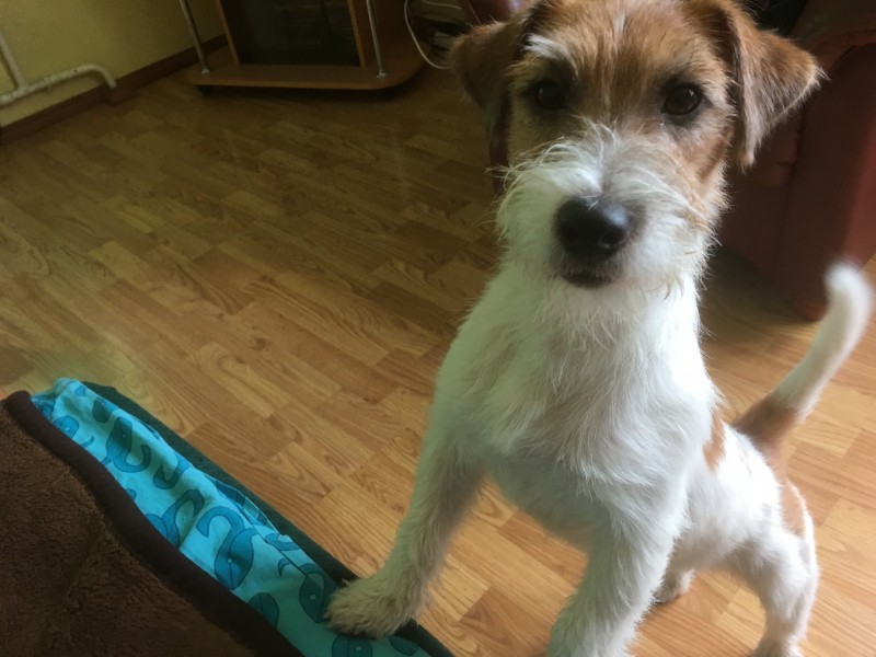 Džeka Rasela terjers. Balts ar brūniem plankumiem. Pazušanas brīdī bija ar brūnu kakla siksniņu.