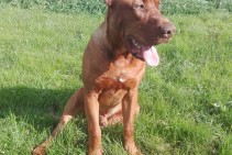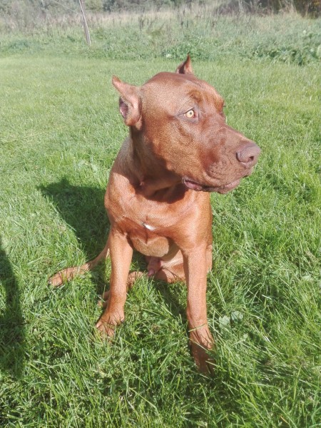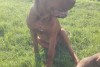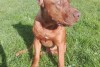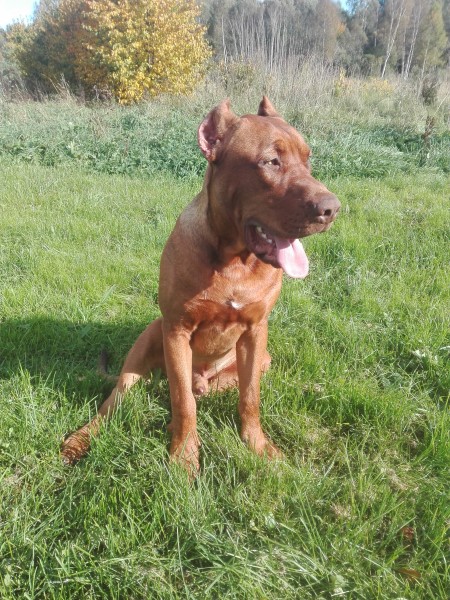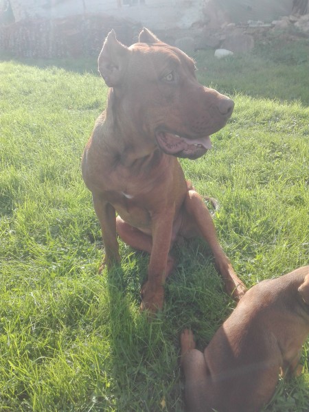 Bordo brūns suņu puika 10 mēnešus vecs. Brūna kaklasiksniņa. Kupētas ausis.Uz krūtīm pa vidu balts maziņš pleķītis - punktiņš. Bordodoga un brūnā dobermaņa krustojums. Nevar ielekt gultā, bet pievelkas ar priekšķepām un ievelk taisnas pakaļkājiņas.