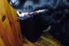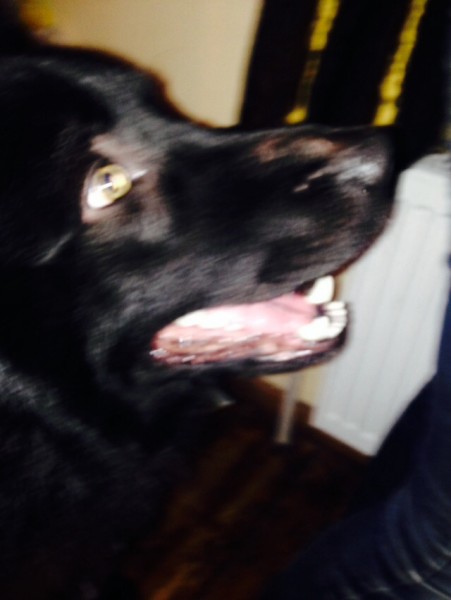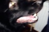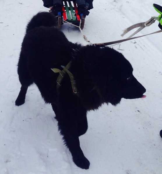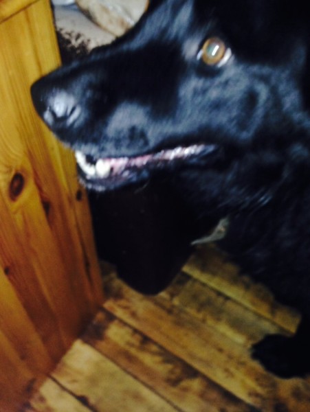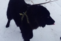 Melns; garspalvains; kaukāzieša un labradora krustojums; ar pelēkzaļu kakla siksnu