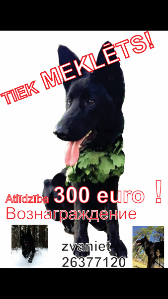 Pazudis melns vilku sugas suns . Atlīdziba par jebkadu informaciju, kas aizvedīs pie suna - 300 euro . Varbūt Jūsu kaiminam ir uzradies jauns suns, kas līdzīgs foto redzamajam ? Pazudis no Rīgas, bet varētu būt jebkur .
