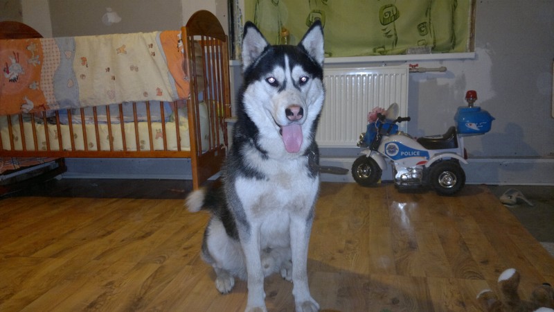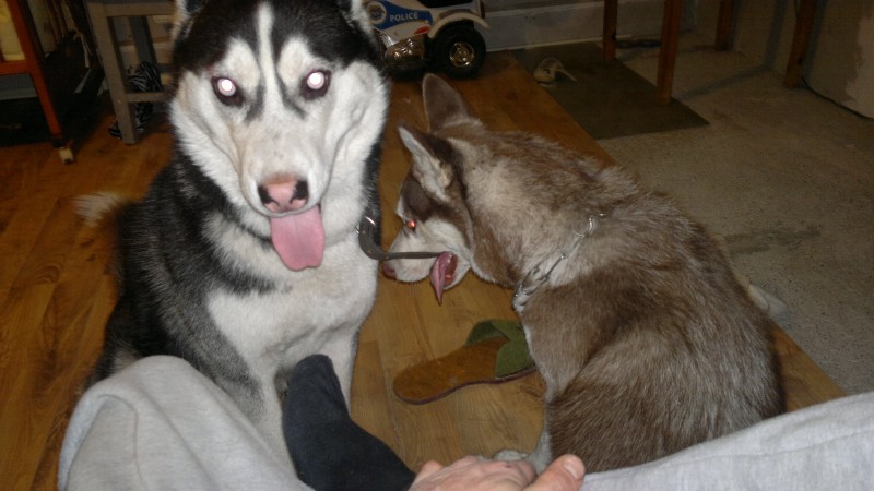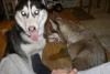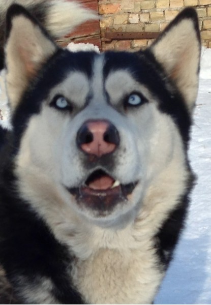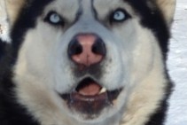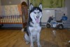 Sibirijas |Haskijs, ar zilam acim, brunu kakla siksnu, aizskreja ar visu pavadu. Sunitim zem skausta tuvak muguraj varetu but vel saglabajusies krevele no retas.