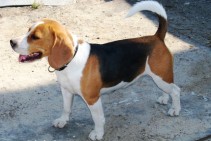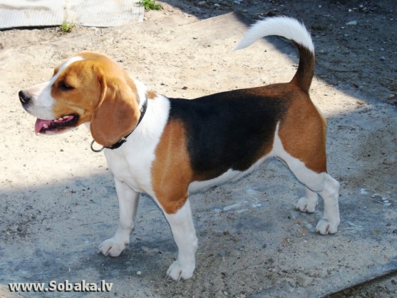 astes gals ir balts ausis uz leju un siksniņa suņa suga ir bigls atsaucas uz vārdu arčī līdzīks kā bildē+-
