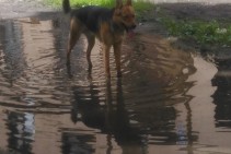 Ar ķēdi, acīmredzami mājas suns. Var just, ka nekaitīgs, bet svešam cilvēkam atteicās tuvoties - vēlējos izlasīt, kas uz ķēdītes rakstīts. Pirmo reizi ar velo braucu garām svētdien pa dienu, otrreiz pēc kādam 2 stundām un viņš joprojām bija turpat.