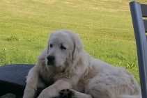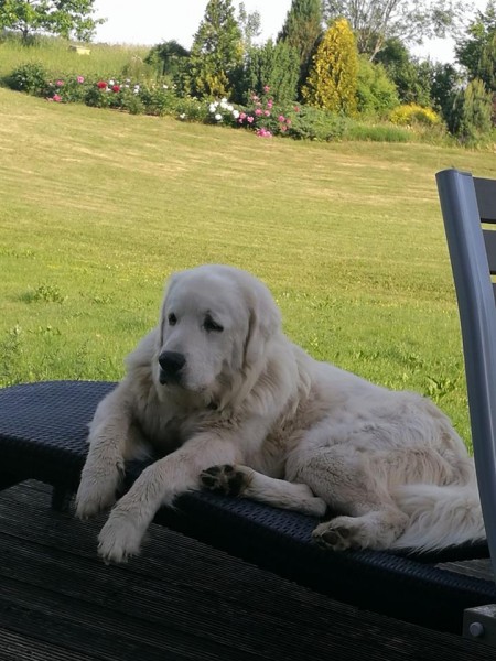 Pazudis suns. Liela auguma, balts, zaļa kakla siksna