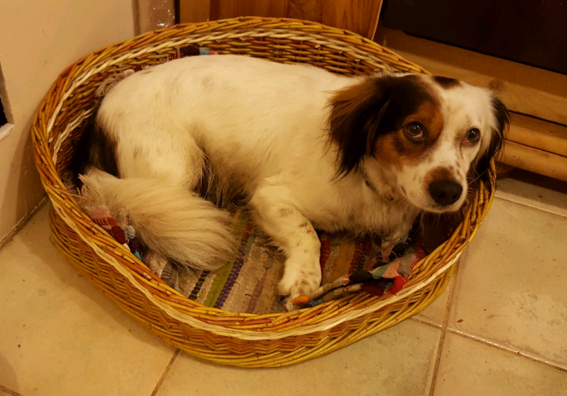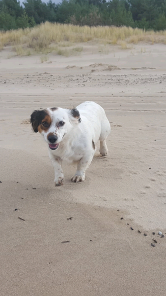 Balts suns ar pagaru spalvu. Melnām ausīm. Brūna-melna spalva apkārt labajai acij.