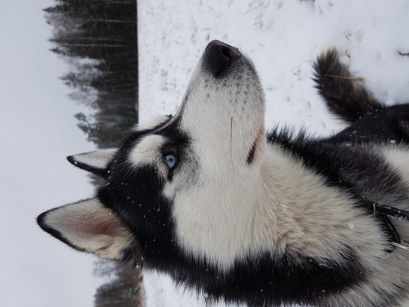 Sibīrijas haskijs. Gaiši zilas acis. Pie mutes sarkans plankums. Atsaucas uz vārdu Bairons.