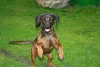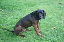 Bavārijas asinpedu dzinējs tumši brūnā krāsā, ar kakla siksni un Ventspils pilsētas suņu reģistrācijas žetonu, ar garmin sistēmu vārdā Makss