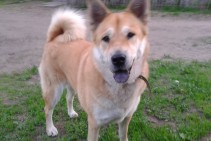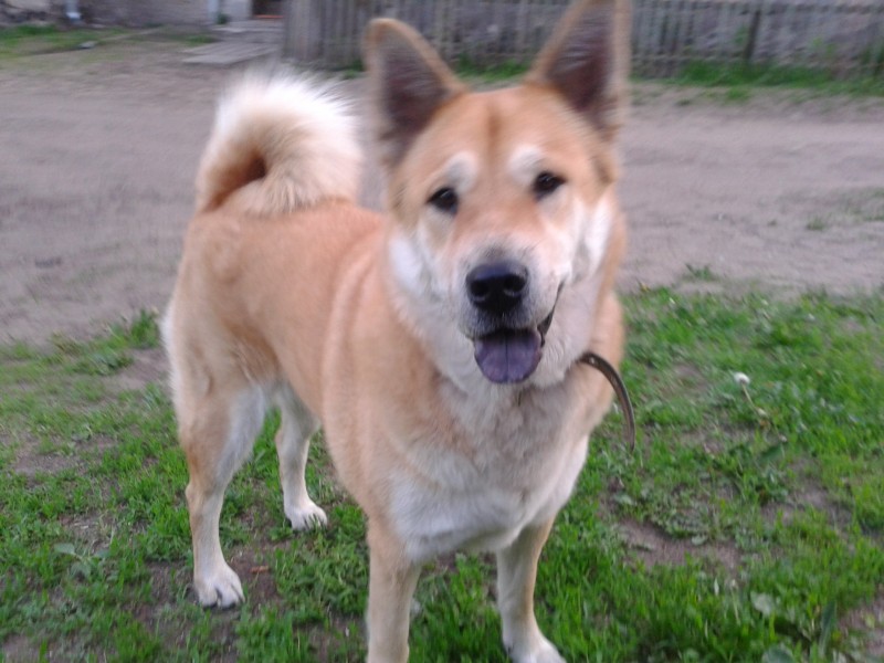 Ruds, līdzīgs šķirnei akita, zaļš žetons ap kaklu, vidēja auguma